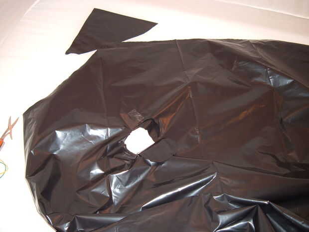 Coloque la bolsa sobre su cabeza y pídale a un amigo sobre la bolsa derecha derivan donde están los hombros. Utilizamos un trozo de cinta adhesiva para marcar los orificios.