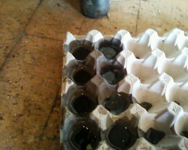 Para convertirlo en arrancadores del fuego ponlo en la caja de huevo, hasta que sobre el medio, derrita la vela y poner la cera en el carbón, hasta la cubierta, espere un poco y luego retirar exceso de tha. Cuando la cera esté completamente seca, rasgar la huevera ' titulares de huevo por la cera y listo.