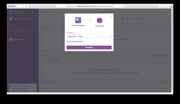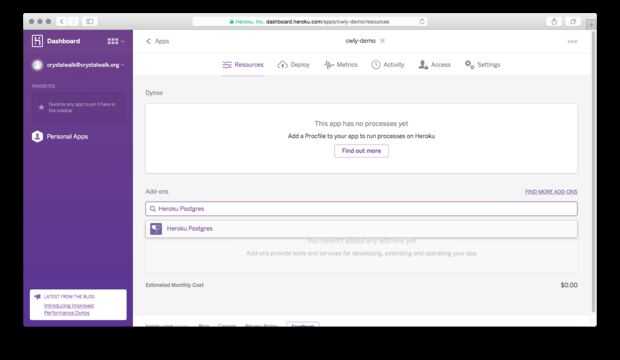 Después de crear la aplicación, haga clic en recursos y agregue un Heroku Postgres, asociándola a la aplicación.