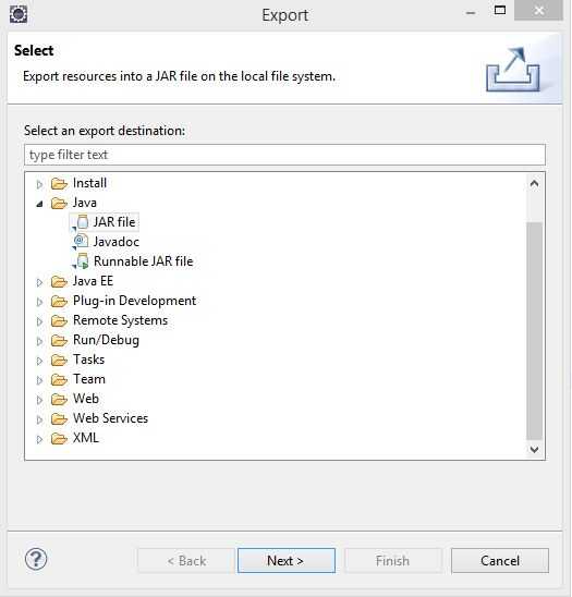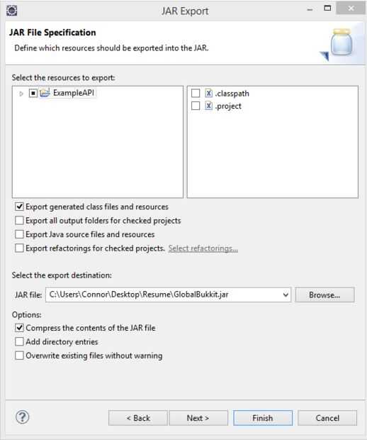 2. una vez había agregado algunos métodos para su archivo de clase, usted está listo para esto de la exportación como un archivo jar! Primero clic derecho en la carpeta fuente de proyectos y selección de exportación. Una vez en la ventana de exportación, seleccione Java -> archivo JAR como se ve en la imagen de arriba. Seleccione siguiente y busque la ubicación de exportación. Tratar de exportar un lugar que recordarás porque este tarro se implementará más adelante! Asegúrese de que la configuración cumple con mina (ubicado en la imagen de arriba) que no sea el lugar de exportación. Una vez que todo está bien, haga clic en finalizar y deje que el compilador de Eclipse empaquetar y exportar tu archivo jar!
