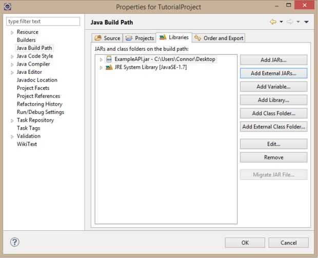 4. Seleccione "Añadir externos JARs..." y vaya a la ubicación de su API, luego seleccione el archivo y haga clic en abrir.