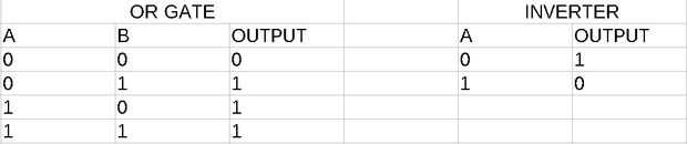 La puerta OR(+) y el inversor (no ~) tiene la siguiente característica como se muestra en la imagen (A y B son entradas lógicas).