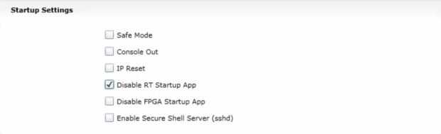 ¿No quieres tu myRIO para ejecutar tu VI en el inicio ya? Puede utilizar su navegador para desactivar startups de RT. Tuve problemas con conseguir que funcione en google chrome, por lo que recomiendo usar FireFox.