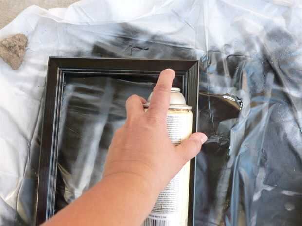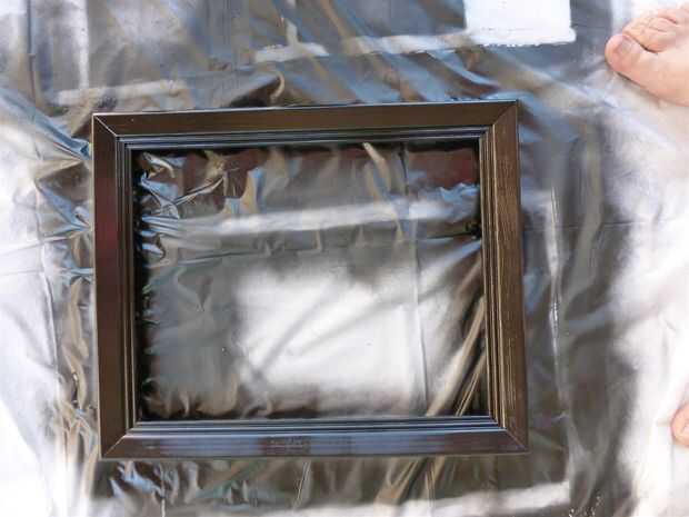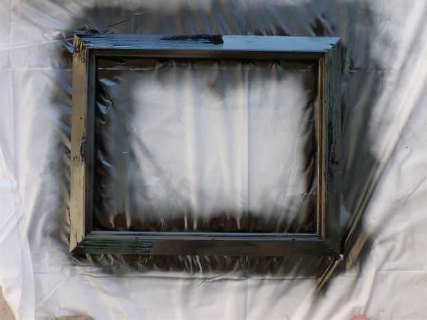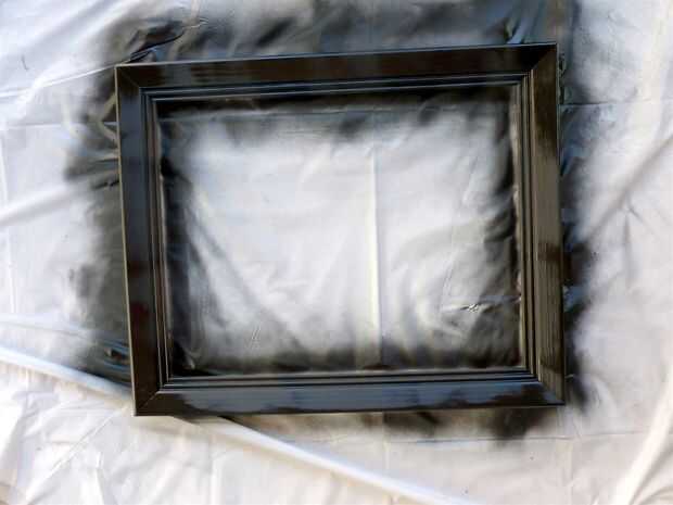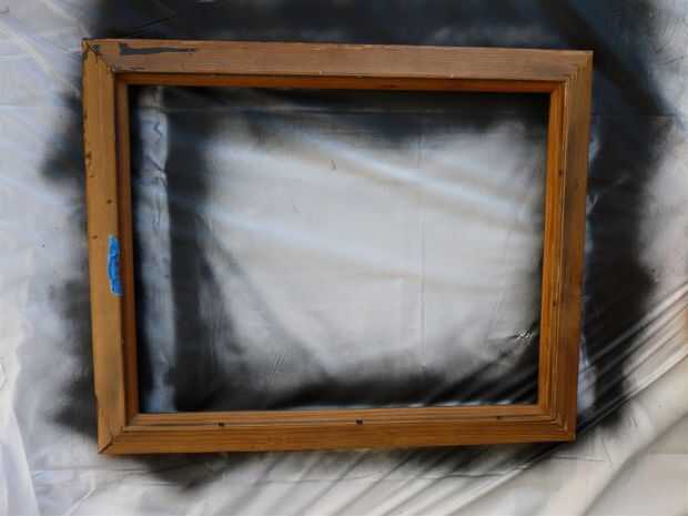 Inicialmente rocía una capa de la pintura de aerosol negra en la parte delantera del bastidor antes de darle vuelta y rociar la parte de atrás. Entonces rocía una segunda capa de pintura en el frente otra vez para cubrir cualquier cosa que podría haber perdido la primera vez.