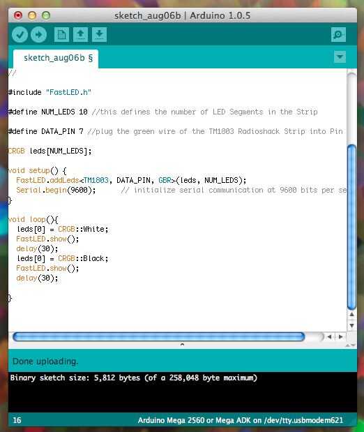 // demo project for the Radioshack LED Tricolor Light Strip // a project for Arduino // by AUDREY LOVE // // // // with great support from the FastLED.io Library // download it here: https://github.com/FastLED // // // #include "FastLED.h" #define NUM_LEDS 10 //this defines the number of LED Segments in the Strip #define DATA_PIN 7 //plug the green wire of the TM1803 Radioshack Strip into Pin 7 CRGB leds[NUM_LEDS]; void setup() { FastLED.addLeds<TM1803, DATA_PIN, GBR>(leds, NUM_LEDS); Serial.begin(9600); // initialize serial communication at 9600 bits per second: } void loop(){ leds[0] = CRGB::White; FastLED.show(); delay(30); leds[0] = CRGB::Black; FastLED.show(); delay(30); }