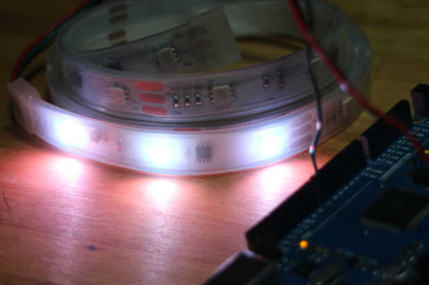 Usé una fuente 12V, un Arduino Mega y una tira de LED Tricolor de Radioshack.