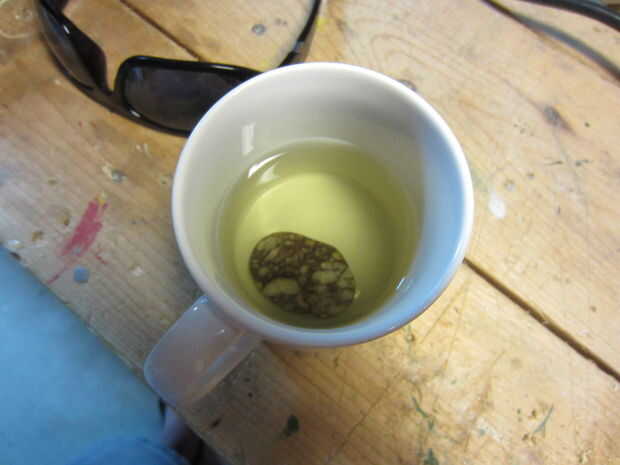 No tengo una foto de la actual ebullición, pero se puede ver el 'té' resultante y la roca como un peso.