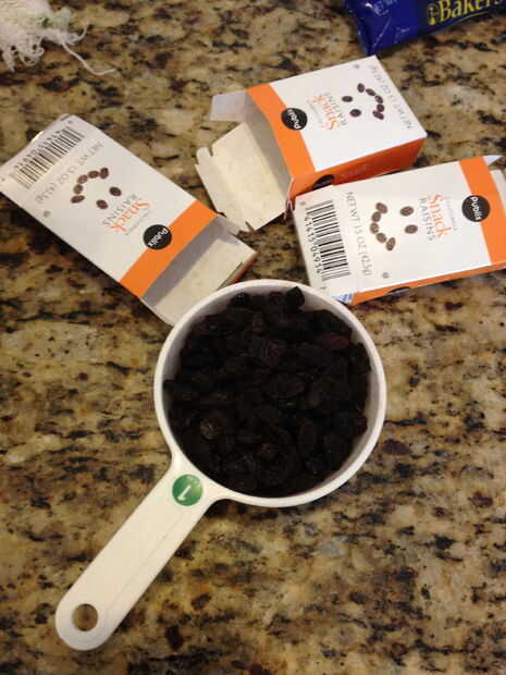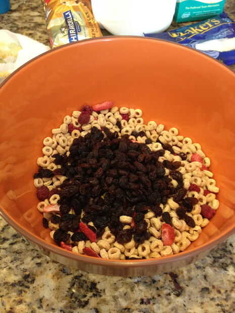 Mezclar el cheerios y las pasas para que cuando la mezcla de mantequilla de maní está lista, la parte "seca" estará listo, demasiado. Esta parte se mueve bastante rápido.