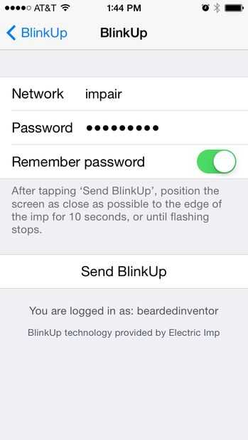 Imp eléctrico utiliza un proceso llamado BlinkUp para configurar a imps. El proceso de BlinkUp parpadeará la pantalla del teléfono a 60hz durante unos 10 a 20 segundos para tránsito ópticamente las credenciales de la red. Si usted es sensible a la luz brillante, destellante debe conseguir a alguien para ayudarle con el proceso. Además, si está encendido el sonido del teléfono, carillones jugará al principio y al final del proceso asi podras mirar lejos durante BlinkUp.