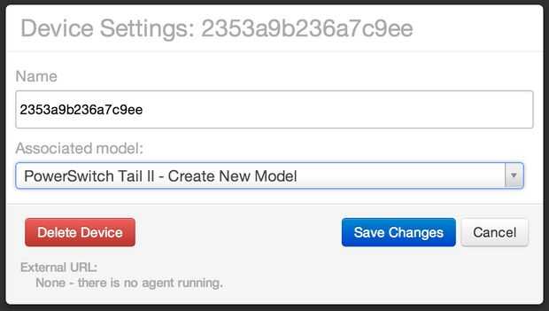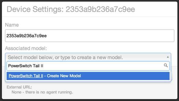 - En el cuadro de diálogo Configuración de dispositivo, haga clic en el "Modelo de asociados" desplegable y empezar a escribir un nombre para su proyecto. Voy a llamar mía "PowerSwitch para cola II."