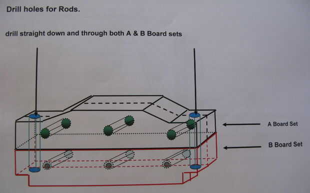 15. Si los orificios no se perforaron con precisión, las varillas no deben caber.  En este caso, ver que la barra golpea las tablas y vuelva a perforar o utilizar una Dremel o una escofina redonda para agrandar los orificios hasta que ambas varillas pueden caber a través de todos los conjuntos de tablas.