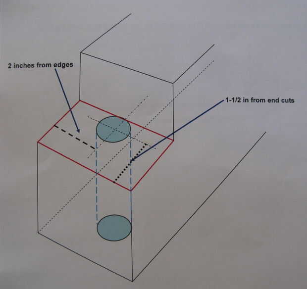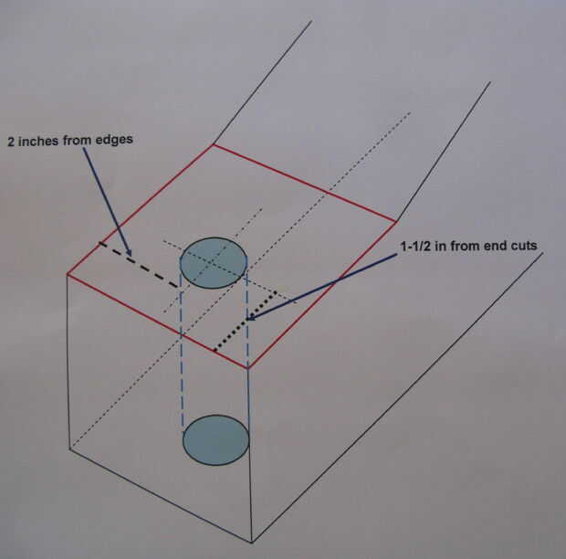 5. Con el taladro o el taladro y una broca de 1 pulgada, corte taladro 1-1/2 pulgadas (centro) desde el extremo de los tableros.  Perforar por el otro lado.  Ver diagramas.