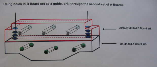2. Lugar un conjunto de tablas en la parte superior el conjunto de tableros de B.  Las cabezas de los pernos de ambos conjuntos de tableros deben hacer frente a la misma dirección.