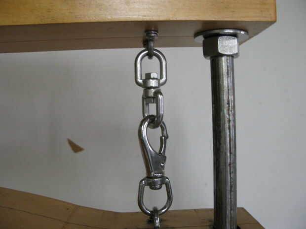 Los tres conjuntos de tablas, una tablas y las tablas B, que se atornillan en el paso ocho se alinearán verticalmente.  Un juego de las tablas A y la B se asegurará a las varillas roscadas con tuercas y arandelas.  El otro conjunto de las juntas A podrán deslizarse a lo largo de la longitud de la varilla.