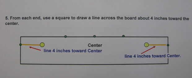- De cada extremo, use una escuadra para trazar una línea a través del tablero, cerca de 4 pulgadas de largo, hacia el centro.