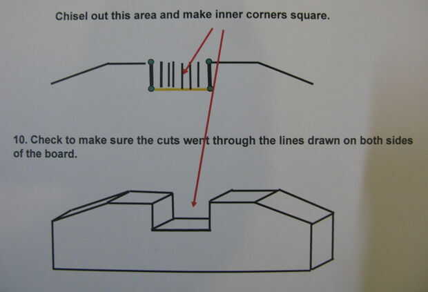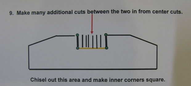 9. Hacer muchos recortes adicionales entre los dos de los cortes del centro.  Cincele el área entre y haga el cuadrado de esquinas interiores.
