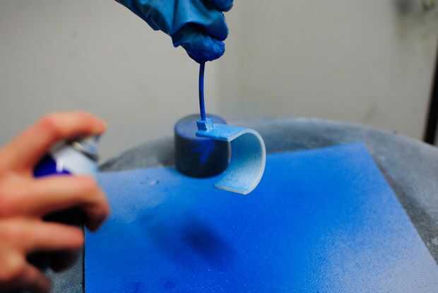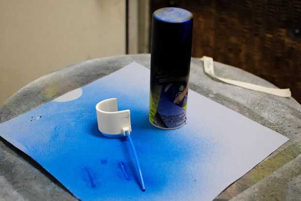 Para hacer el aire de alta presión permanezcan en el hueco del modelo debe ser 'a prueba de aire'. Esto puede hacerse mediante el uso de un spray impermeabilizante. En este caso se utilizó engomado Pasti Dip. Si usted tiene cualquier pieza que se imprimió demasiado delgada, asegúrese de poner algún spray extra en esa zona. También asegúrese de rociar completamente alrededor del cable a la boquilla. Hubiera podido rociar más de una vez. En ese caso, asegúrese de esperar al menos 20 minutos (o lo que dice la etiqueta de su spray) entre cada spray. Utilizar guantes y mascarilla y spray fuera o en un gabinete de rociado.