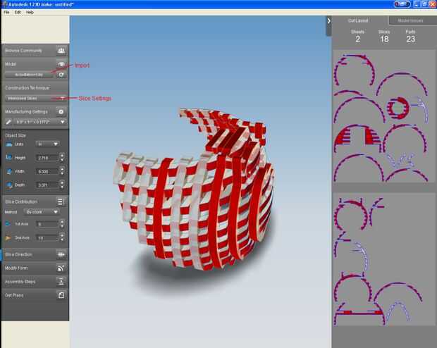 Si usted pasó por paso 1 ya tiene un objeto Si no, necesitarás un OBJ para este paso. Como es un tipo de archivo abierto podrá importar a Blender, Netfabb o Meshlab (todos los programas gratis) y poder exportar al objeto Ahora que tienes tu OBJ abrir Make 123D e importarlo. Hay un botón de la izquierda que dice importar..., haga clic en y seleccione el archivo. Una vez que se haya cargado, usted podrá seleccionar su técnica de construcción. Jugar con ellos, ver lo que se ve mejor y funciona para ti. Para mi ejemplo, usé rebanadas enclavijado. Ahora usted puede configurar su material.