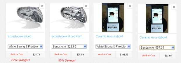 Ahora tiene un archivo OBJ de Make 123D, que puede llevar detrás a un software de modelado para editar, o seguir adelante y subir. Hay varios sitios que ofrecen servicios de impresión 3D. Google, buscar el que le guste. No quiero mostrar sesgo por lo que no voy a mostrar como subir sus piezas. Le mostraré un ejemplo de los ahorros de precio aunque a través de Shapeways como mi impresora de la opción y para mostrar que el uso funciona. Verás que un modelo no-cortado en FSM es $102,39!!!!!! Wow caro para un soporte acústico para un teléfono (que es lo que es mi tema). A ver que tengo 2 versiones del modelo en rodajas. Uno está diseñado para la piedra arenisca que requiere paredes de 3mm y uno diseñado para el FSM como te he mostrado cómo producir. Con esta técnica el diseñado para la piedra arenisca es $28,80, y diseñado para FSM es $28,73. Estos modelos no son ahuecados como mostré en el paso opcional 1. Ello les haría aún más barato!