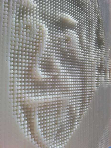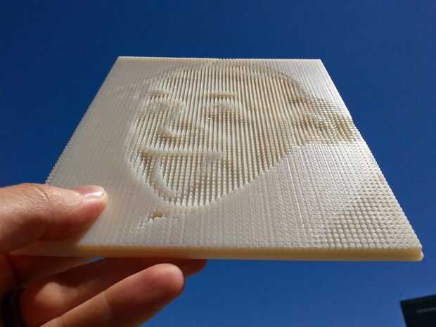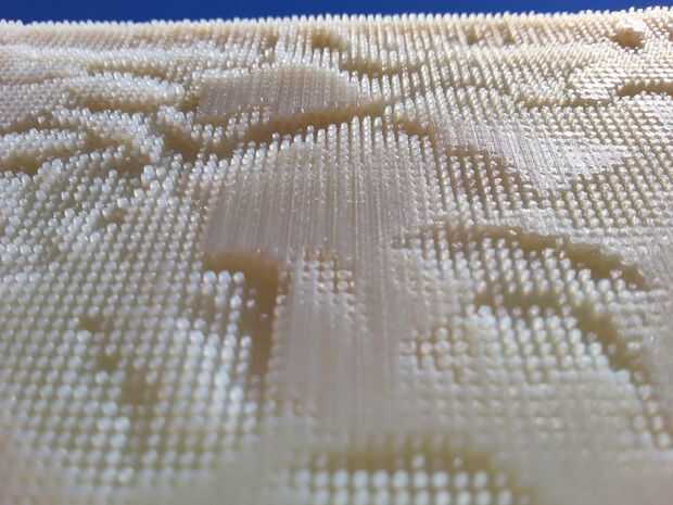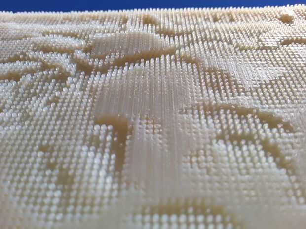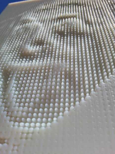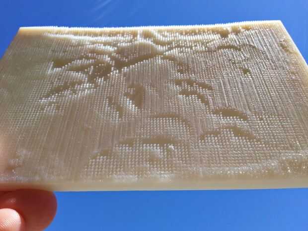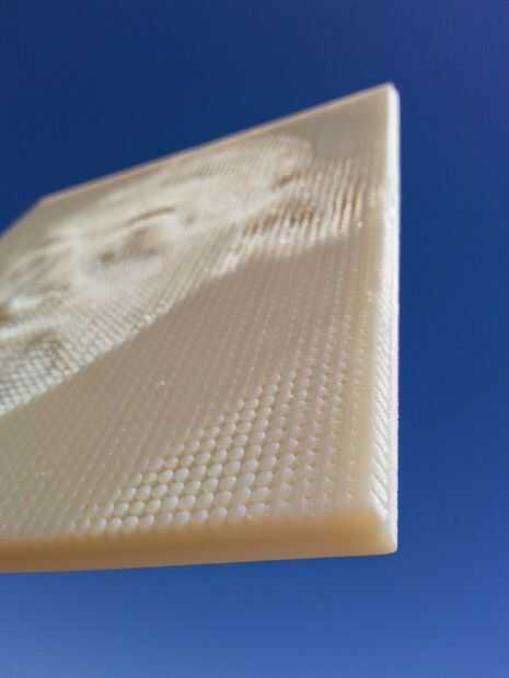 Con el material plástico más duro, pequeñas inconsistencias en la planitud de la superficie superior telégrafo directamente a través de la impresión final. Comparar la impresión azul de arriba con el negro: la impresión azul de los vino de un bloque en un plástico blanco duro, la impresión negra vino de un material más suave llamado Tango + negro. Nota que la impresión azul tiene una serie de rayas verticales: a pesar de la alta resolución de las impresoras de objet, estas líneas de la cabeza de impresión causan distracciones principales en la impresión de 3d resultante.