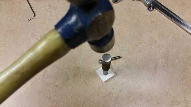 Alinee su tuerca con el bolsillo, centro de su golpe y martíllelo cuidadosamente. Si está utilizando una tuerca nylock como yo, asegúrese de que el nylon es en la parte superior. Tenga cuidado de mantener su golpe centrado después de cada huelga, así que no lleves tu parte por error! Usted notará un cambio en la sensación de la huelga cuando la tuerca ha llegado a la parte inferior de la bolsa.