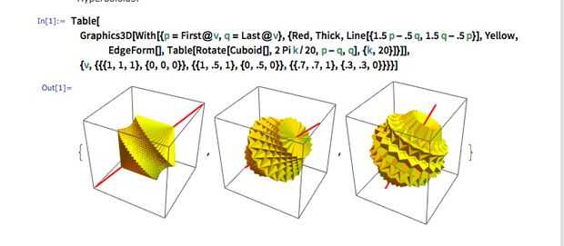 Abra la versión de Mathematica y crear un nuevo cuaderno. Utilizaremos un script sencillo * que crea serie de cuboids que giran alrededor de un eje central. Por cambio de grados de rotación, podemos obtener resultados únicos. Para hacer las cosas simples, he incluido mi notebook en los accesorios. Descargar y abrir para jugar con modelos tanto entender la secuencia de comandos.