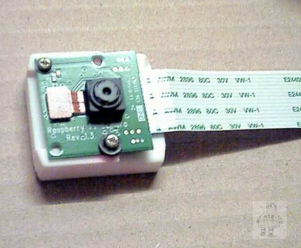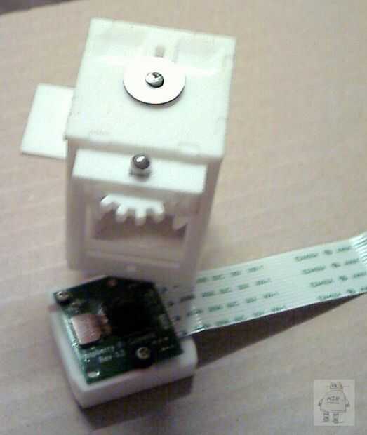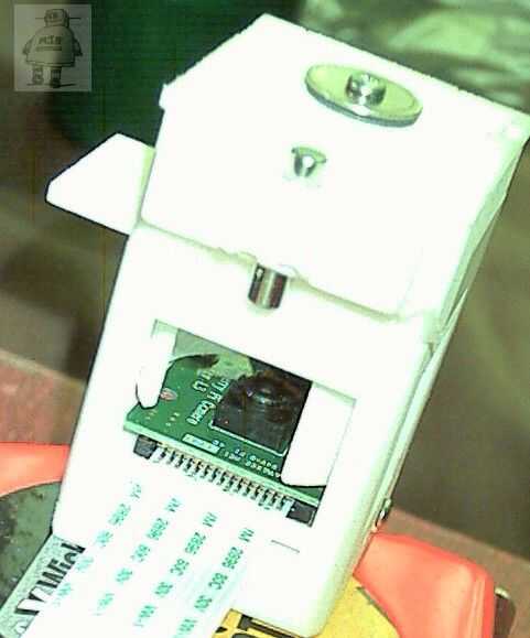 La cámara se monta en el bloque con dos tornillos autorroscantes pequeños. Existen arandelas aisladas bajo las cabezas de los tornillos para evitar que raspar la superficie de la PCB. La lente de la cámara debe estar en la línea de centro óptico--en el archivo STL hay dos ranuras en los lados para mostrar la línea central de este.