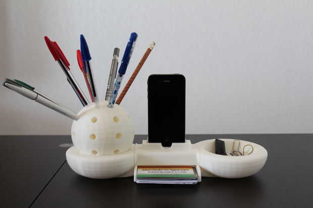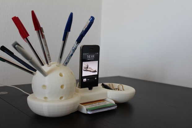 Se compone de una esfera en forma de sostenedor de la pluma, un compartimento para tarjetas de visita, una ranura vacía., y por supuesto se puede utilizar como un muelle de carga para tu iPhone.