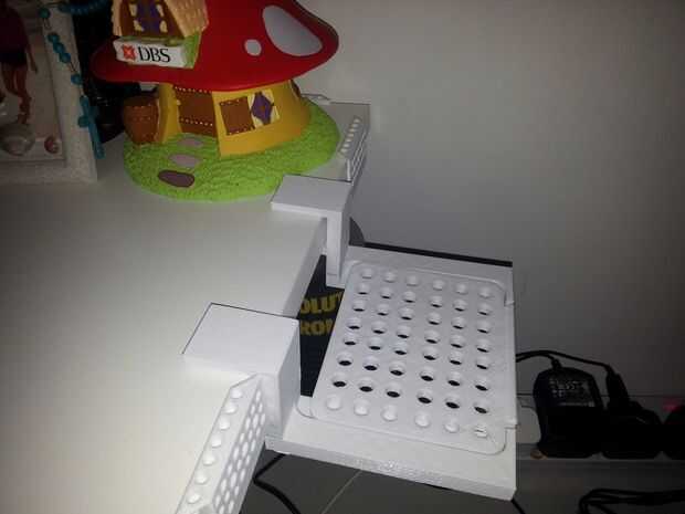 Configuración existente primero se modela en Solidworks y entonces se agregan las piezas necesarias para la extensión al crear los modelos 3D adicionales. De esta manera, todo es fácilmente visualizado y creado a escala, no hay necesidad de mantener el control en las mediciones. El tamaño de las dos piezas de soporte son más grandes que el área de la cama de impresión, por lo tanto se descompone e impreso en dos partes, Unidas por pegamento. Ver el video de todo el proceso de creación, de modelado 3D para impresión.