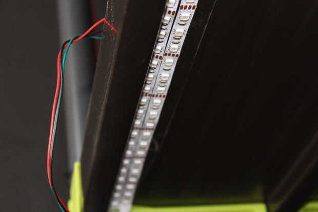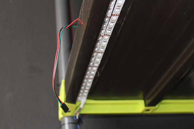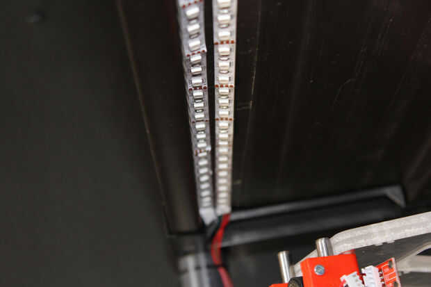 La plataforma natural crea sombra sobre las impresoras, así que por esa razón LED tiras se pegan en la parte inferior de cada estante para iluminar el espacio de construcción de la impresora 3D.