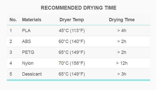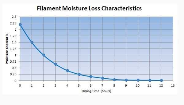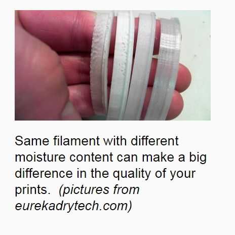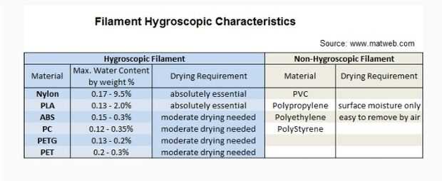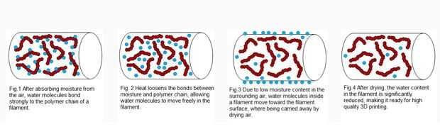 La comunidad de impresión 3D comúnmente utiliza absorbentes de humedad para ayudar a prolongar la vida útil de almacenamiento, pero no realmente "tiran" el agua fuera del filamento. Sólo guardan lo que empeoren. Una vez mojado, filamento debe ser calentado en un ambiente seco a seco hacia fuera.