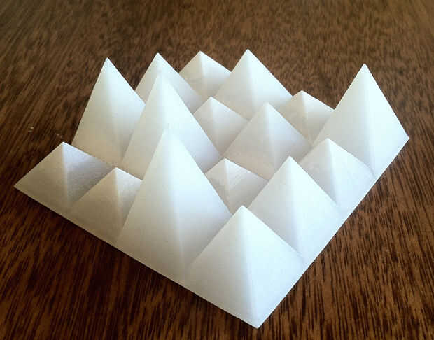 Aquí es lo que tengo detrás, plástico translúcido impreso en "detalle de helado". Mi siguiente paso es hacer un PCB con LEDs direccionables para poner en su interior para que pueda iluminar cada pirámide y hacer algún tipo de luz de mesa objeto de arte.