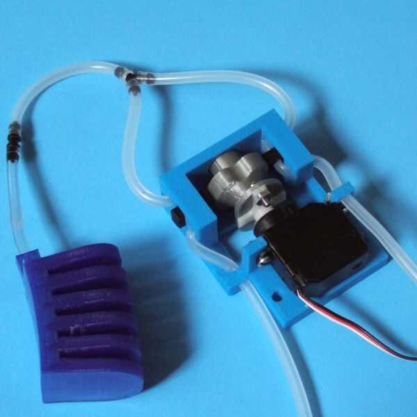 La válvula impresa 3D es realmente dos válvulas que son controladas por un micro servo. Cuando se gira la leva (gris) para el centro, ambas válvulas están cerradas. Desde allí, uno puede estar encendido, uno a la vez. Los seguidores de leva (negro) empuje el tubo de silicona para comprimirlo y crear válvulas de manguito simple.