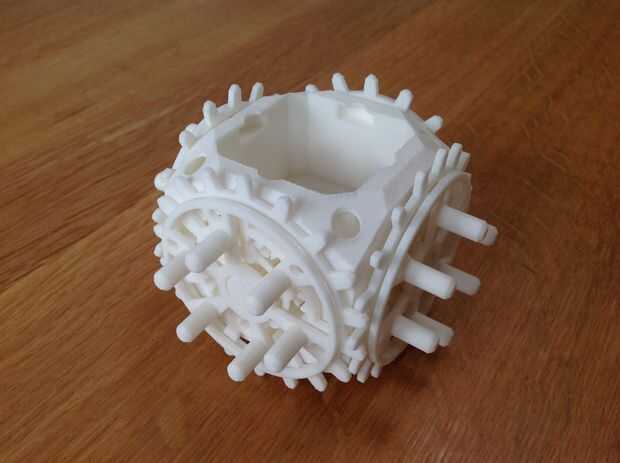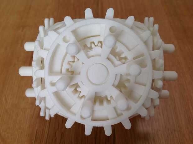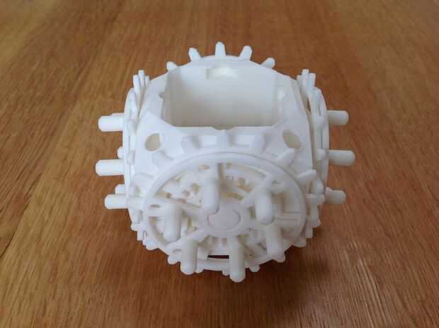 ¿Qué es lo? Para probar totalmente 3D impresión de capacidad de producir piezas mecánicas complejas totalmente montado diseñé la 'cubo orientado de 28' que es un juguete de escritorio impresos 3D que, como su nombre lo indica, es un cubo con 28 engranajes; girando cada uno de estos 28 engranajes, los otros 27 engranajes también gire en un fascinante patrón. Esto era 3D impreso mediante el servicio de impresión 3D Shapeways en el material blanco, fuerte y Flexible. Mientras que yo quería probar la impresión 3D, también quería diseñar algo que se veía bien y realmente te hace cuestionar lo que estaba sucediendo al girar los engranajes.