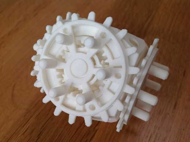 Para lograr esto, se arreglan los 28 engranajes así sucesivamente por cada uno de los 4 lados del cubo son 7 engranajes: 2 los externos grandes que se mueven en direcciones opuestas, el engranaje exterior tiene manijas en él por lo que se puede girar fácilmente, el movimiento entre los 2 dientes grandes en cada cara se invierte debido a 5 más pequeños engranajes set dentro del cubo en un diseño similar a una caja de engranajes planetaria para invertir la dirección de los grandes engranajes en cada uno de Estos 4 caras. Cada uno de estos conjuntos de engranajes de 7 en 4 caras son todos gusto a través de uno de los grandes engranajes en cada una de las 4 caras mallado a 90 grados con uno de los grandes engranajes en cada uno de los 2 lados vecinos. Esto significa que si se hace girar todo un arte, todos ellos girar en forma de memorización.