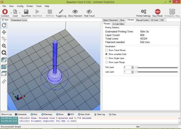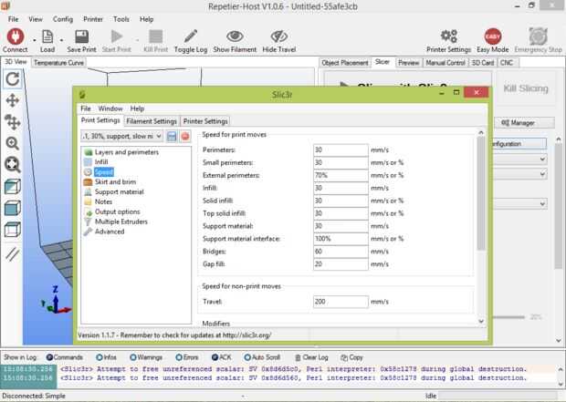 Utilizar el software de host de la impresora 3D favorito y cortar su modelo 3D en GCODE. Ver velocidades sugeridas para cada material y utilizar el más lento de los dos. Encontrar un equilibrio adecuado de relleno, altura de la capa y ajustes de contracción para su impresión. Cuando esté listo, calienta la impresora y el primer material de la carga en la impresora. Será posible cambiar temperaturas más tarde al cambiar a un segundo material. Mi primer material fue NinjaFlex negro.