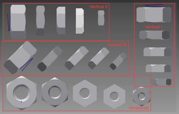 Para evaluar las variaciones en la resolución de la función debido a la orientación, imprimí cuatro instancias de cada parte. Con el eje de hilo perpendicular a la superficie de la estructura (horizontal) y tres con el hilo de rosca eje en paralelo a la superficie de construcción pero en 0 (vertical II), 45 (III vertical) y 90 (vertical I) grados en relación con el eje x. He anotado una foto del modelo 3D a las orientaciones de la etiqueta.