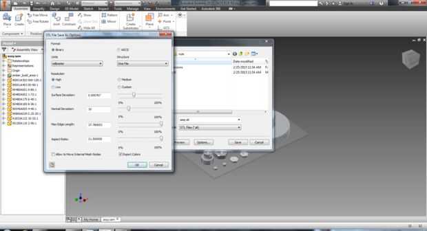 Después de colocar las piezas, he desactivado la pieza de suplente del área de construcción para evitar que aparezcan en el resultado final y había exportado la Asamblea en formato STL. Al exportar, es necesario cambiar las unidades de la STL exportada a milímetros editando las opciones accesibles desde el cuadro de diálogo de exportación después de elegir STL como el formato de exportación. Además, elegí el alto detalle para asegurar que se generan divisiones exactas.