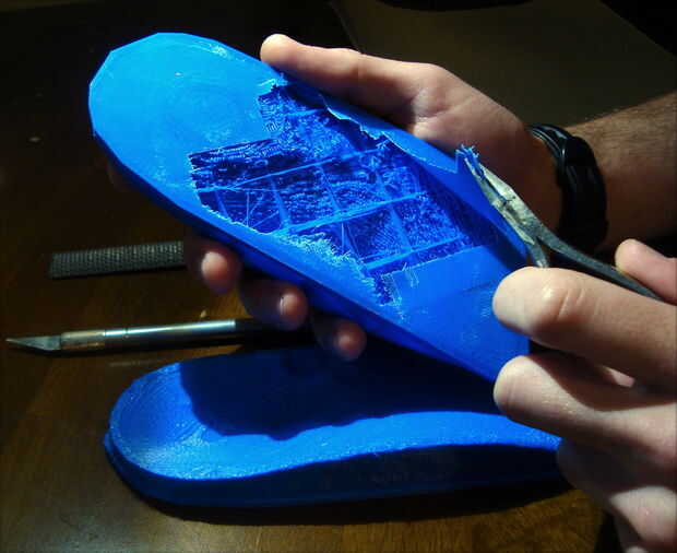 Debido a la configuración que elegimos la impresora 3d, hay algunas características únicas para estas impresiones ortesis. En primer lugar, usted notará que hay una superficie dura y gruesa. Esto es debido a la gran cantidad de capas de la superficie superior que especifica. Nido, la superficie inferior es realmente delgada y frágil. Una vez más, esto es porque sólo elegimos tener 2 capas de fondo. Por último, debido al bajo relleno, hay muy poco material entre el fondo y las capas superiores. La razón de tal una pequeña cantidad de material en la parte inferior y el interior es que todo esto se consigue de todos modos! Así que, vamos a empezar con eso!