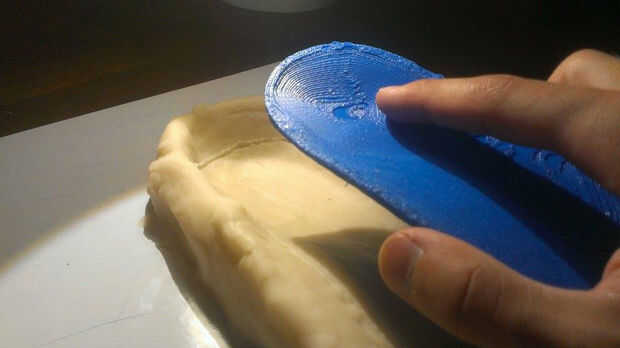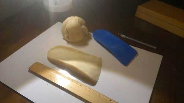 - Para hacer el más fácil de modelado en 3D, quitar la arcilla sobrante de alrededor del molde. Tomar una pieza de calzado regular y la primera mitad del relleno sobre la arcilla del esquema. Utilice un cuchillo de mantequilla para cortar hacia abajo desde todos los puntos de este bosquejo. Tenga cuidado de no alterar el pie del molde mientras preforming este paso.