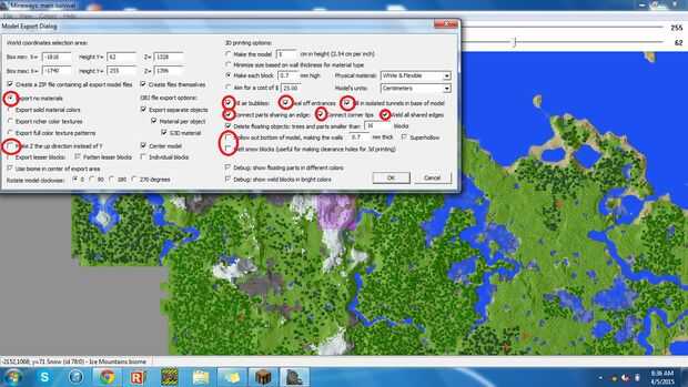 Antes de exportar mira en la parte superior y cambiar la profundidad más baja a la profundidad que escribió abajo solución. Una vez que estés feliz con las dimensiones del área seleccionada, seleccione archivo y exportación para impresión 3d. Luego tienes que nombre el archivo de tipo de cambio el archivo OBJ mineways tiene la opción de STLs pero no imprimible STLs. Asegúrese de que todas las opciones en un círculo se seleccione o cancele como se muestra en la imagen. El obj de la exportación y luego ponga en usted está el escritorio.