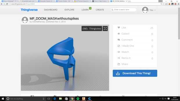 Yo sabía que quería utilizar la impresora 3d que tenía a mi disposición, así que lo primero que necesitaba era una imagen 3d de su máscara. Suerte para mí, thingiverse usuario mitchellharvey había publicado un archivo de stl de máscara de tamaño completo en detalle exquisito. Big ups para el archivo! * lado tenga en cuenta, envió un mensaje al usuario para preguntar si estaba bien en mencionar su archivo aquí, pero nunca recibió una respuesta. Si él quiere que no la utilice por cualquier motivo aprovecho esta abajo *. Así que lo primero que tenemos que hacer es agarrar el archivo y descargarlo!