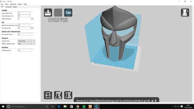 Yo uso el programa corte Cura para preparar todos mis impresiones, que permite un fácil mirar el diseño que se especifica para cualquier impresora que está utilizando. En mi caso fue una ultimaker 2. para ello, basta con abrir el programa y luego archivo > cargar modelo archivo > seleccionar la máscara de doom. Como puede ver ahora, la máscara es demasiado grande para la impresora ya que es del mismo tamaño. Necesitamos la escala.