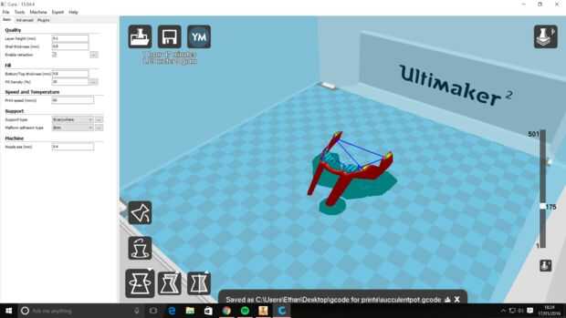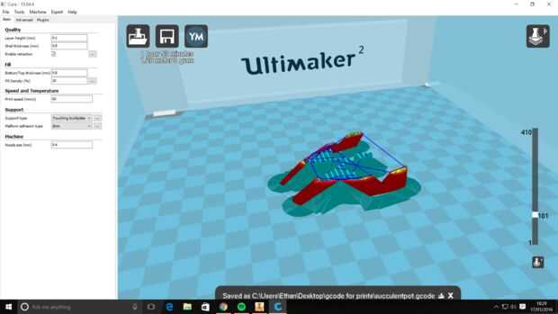 Cura le da la habilidad de ver el camino impresión capa por capa. Esto es una buena manera para ver si ha establecido bastantes ayudas y solucionar problemas de las áreas que parecen dudosos. Configurar éste para ayudas por todas partes. Esto coloca soportes donde con a los cuernos de la parte inferior de la máscara de los ojos y una altura debajo de la punta con picos de la máscara. Se trata de la mejor manera de imprimirla para evitar que la máscara de su defecto. Como nota al margen, siempre es bueno tener la herramienta de borde encendida como se construirá una superficie impresa plana fácilmente extraíble para la máscara imprimir en. puede ver el borde correcto en la segunda foto.
