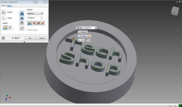 Esto será fácil. Hacer otro dibujo 2d. Esta vez lo hacen dentro del anillo levantado de la pieza de checker. En el editor de texto en Inventor y escriba las palabras TechShop (ver foto 4). Ajustar según sea necesario para que encajen en una forma que le guste. Haga clic en el dibujo final.