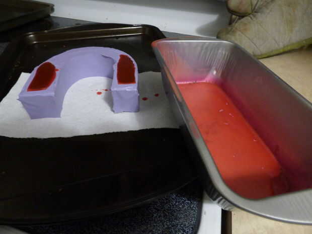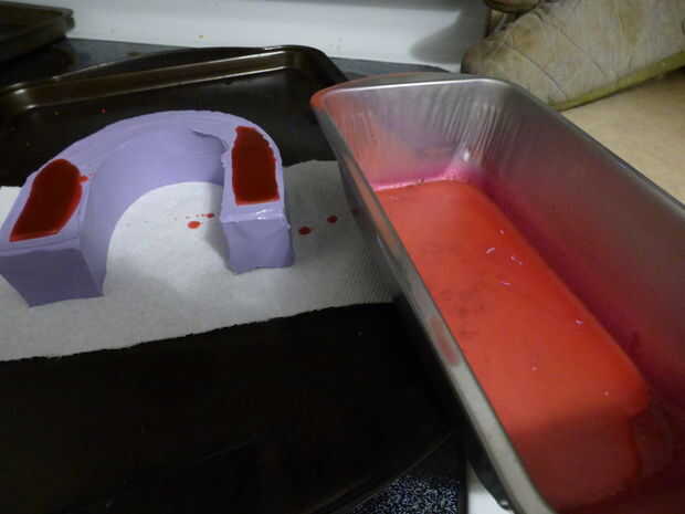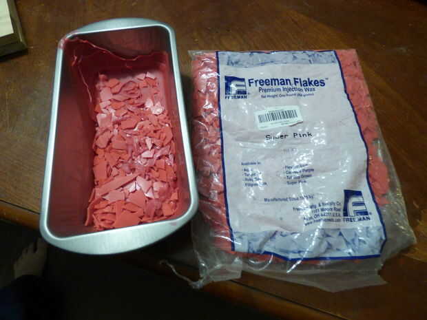 Por supuesto que algunos de ustedes preguntan "cómo derriten la cera para el molde?", todo lo que necesita hacer es obtener un molde de pan acero (sacrificio) barato de tienda de dólar. Luego calentar su horno según la temperatura de waxs especificada por el vendedor. Mina fue de alrededor de 200 grados fahrenheit. Sólo calentar el horno a la temperatura y calentarlo hasta que la cera se convierte en una piscina en la sartén. cuando es bastante delgada entonces usted puede verter en el molde. Y lo que están sacando una copia rellenada del agotamiento de su impresión. y ahora para la fundición (Metal melter)!!!!!! (después de estos mensajes)