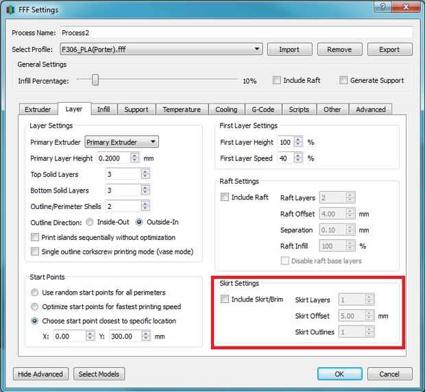 Importante: Muchos por defecto incluye una falda de la primera capa. Asegúrese de desactivar esto en la pestaña de capas para el segundo proceso. Queremos dibujar una falda en el aire.