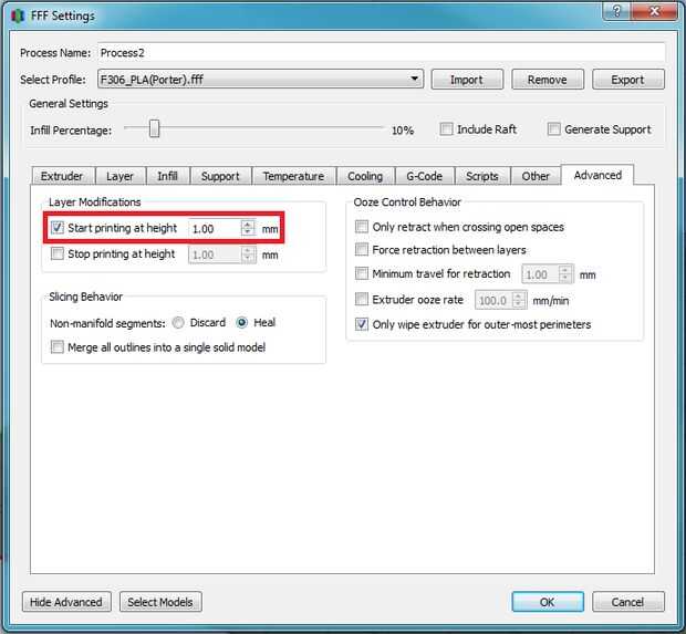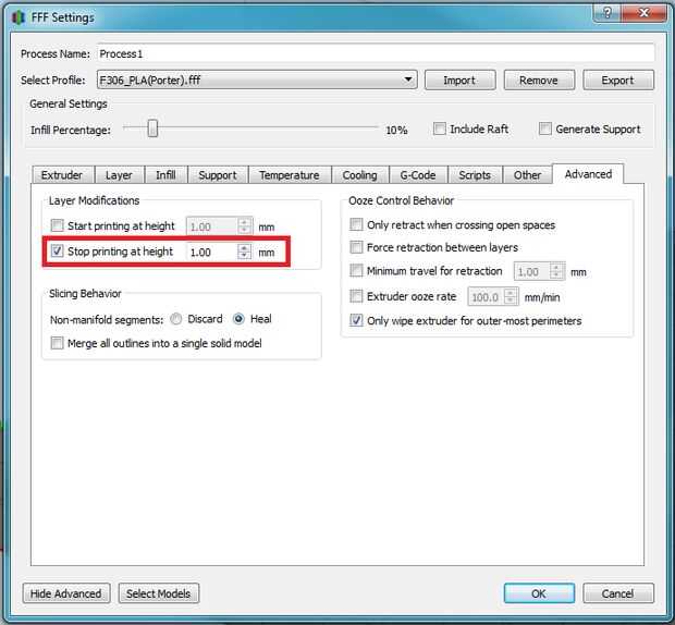 Para ajustar la altura que queremos detener y cambiar colores, abrir el primer proceso y vaya a la pestaña avanzada. Bajo capa de modificaciones que necesitamos consultar "parada de impresión a la altura" y Dile la altura de corte. Para mi moneda de la CSU he utilizado la altura de mis rayas, 1.00 mm.
