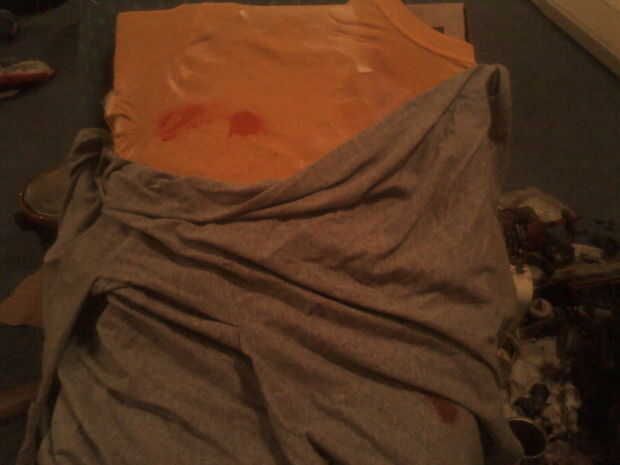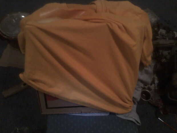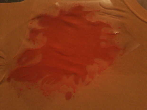 Usar algo para bloquear a gotas y sobrepulverización lejos del resto de la camiseta. Periódico es bueno, u otra camiseta que no importa.