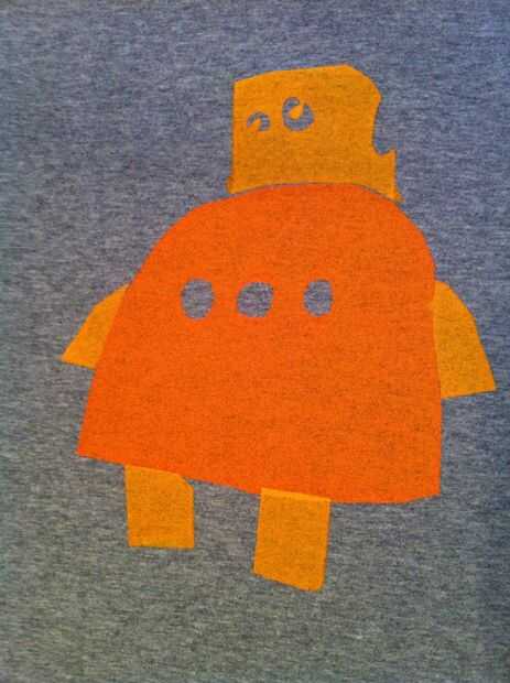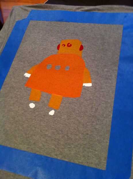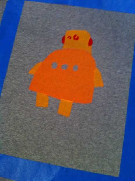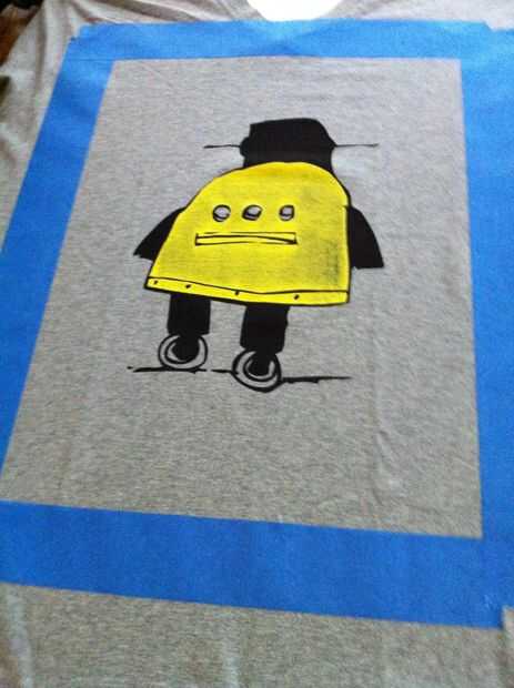 Esta parece que debería ser sentido común para mí pero no fue. La cosa es, si usted está haciendo un dibujo, como el robot en este ejemplo, poniendo el negro en la parte inferior será hacer la plantilla mucho más fáciles de cortar. El problema es que imprimir colores como amarillo encima de tinta negra se ve bastante mal. Bueno, no está mal, pero el negro demuestra a través. Si desea hacer la camisa se vea desgastada, esto es una buena técnica, pero mina acaba de salir mal, así que no recomiendo usar negro como capa base.